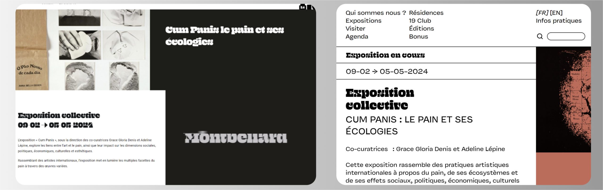 Pour l'identité graphique du site de l'exposition "Cum Panis", nous avons opté pour une approche qui allie clarté et lisibilité. Nous avons choisi de maintenir un aspect informatif et facile à lire en utilisant principalement le blanc et noir. En même temps, nous avons veillé à conserver l'identité graphique d'origine en utilisant les mêmes polices de caractères. L'organisation et la disposition des éléments ont également été pensées pour évoquer l'esthétique du site d'origine, offrant ainsi une continuité visuelle.