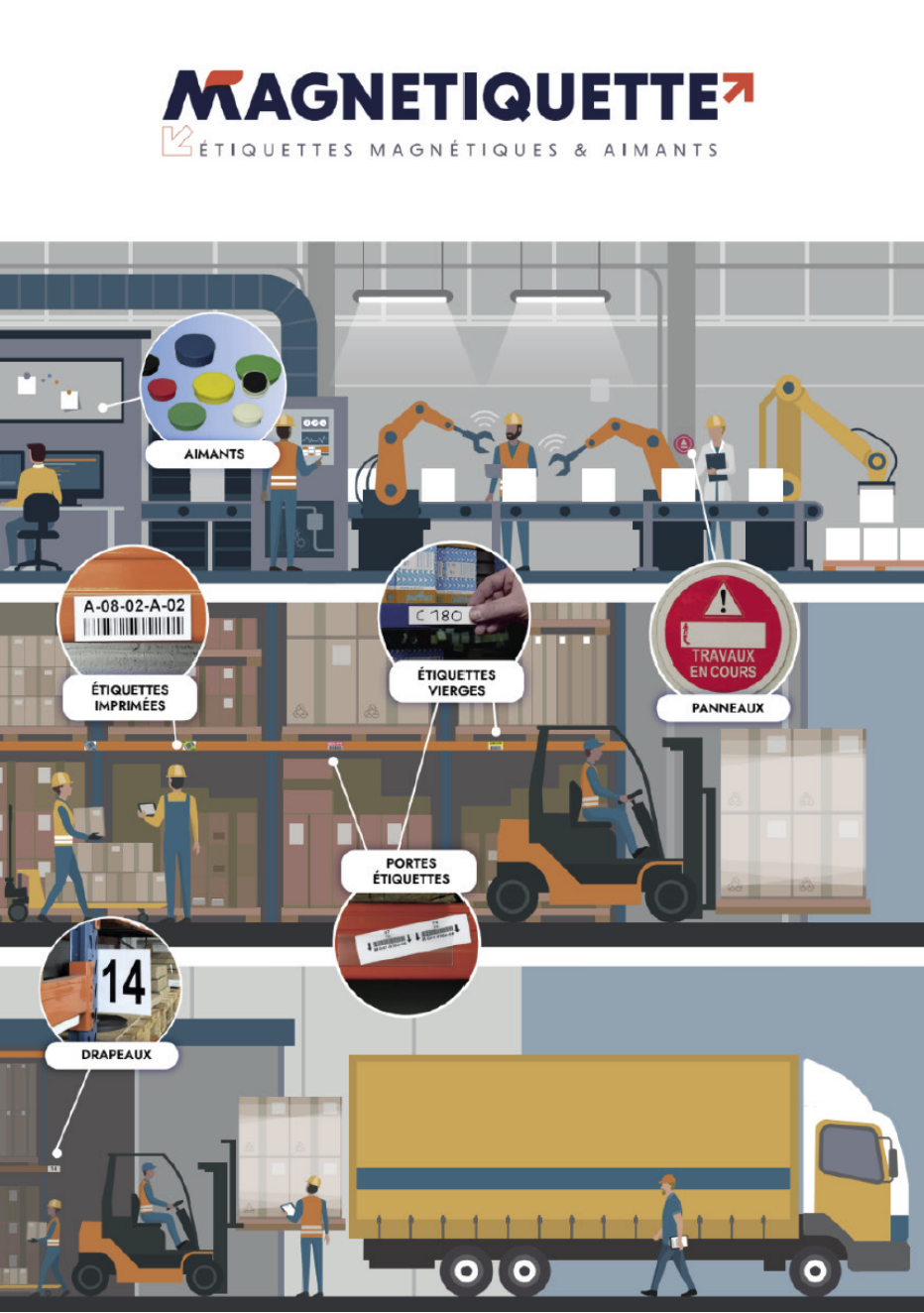 Magnetiquette souhaitait une plaquette imprimée pour la diffuser auprès de potentiels clients. Cet outil de communication fait suite à un travail initié par l’agence 13ème Étage qui a redéfini la charte graphique notamment avec une refonte du logo de l’entreprise Magnetiquette. J’ai donc repris cet esprit pour réaliser le visuel de la couverture sur Illustrator qui reprend les codes de l’industrie et met en avant toutes les applications des produits Magnetiquette, sur la base d’un visuel issu d’une banque d’images.
